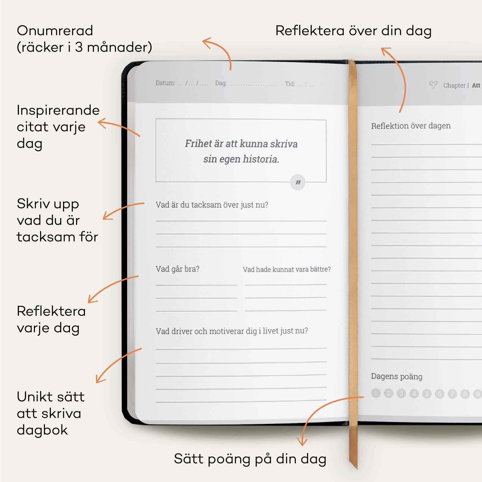 Frågorna som ställs i denna dagbok hjälper dig att fokusera på vad som är viktigt för dig i ditt liv. Värdefulla stunder för självreflektion för att få ut mer av dig själv, mindre stress och mer tid för personlig utveckling.